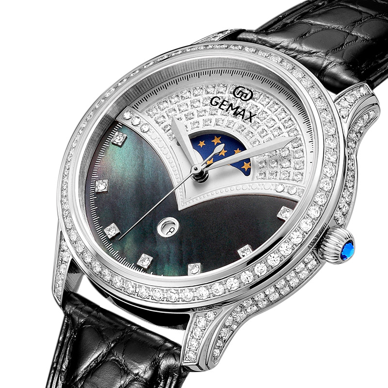 The MX2051 luxury women’s mechanical watch is a perfect blend of sophistication and premium materials, designed for women who appreciate both style and function. The watch features a 36mm 18K gold-plated case, adorned with high-quality moissanite diamonds that shine brilliantly, offering a harmonious balance of luxury and subtlety. Its dial is crafted from exquisite mother-of-pearl, providing a natural luster that enhances the elegance of the timepiece.