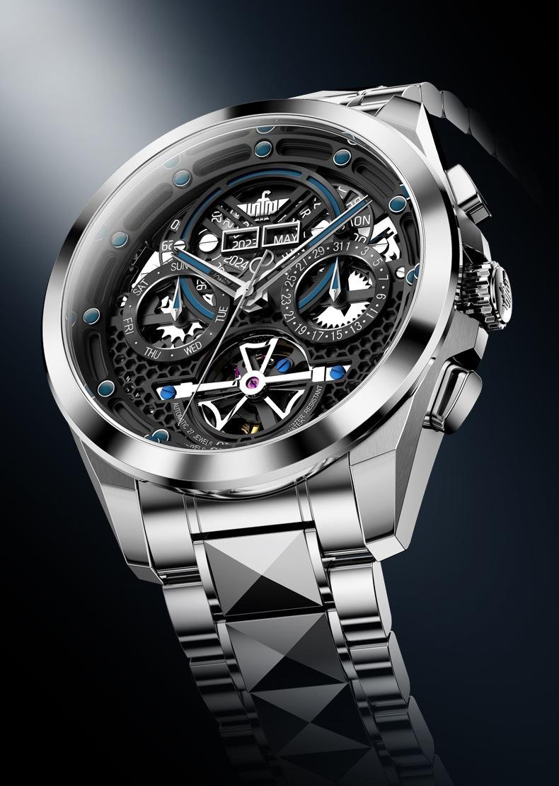 The watch's synthetic sapphire crystal, coated with an anti-scratch layer, ensures durability and clarity during everyday wear. The strap is made from a combination of stainless steel and tungsten, offering both strength and comfort for long-term wear. It features a spring butterfly clasp for secure and easy fastening.