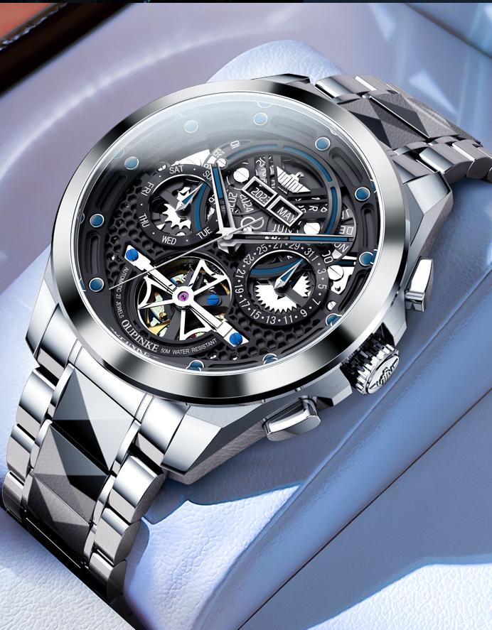 This luxury automatic mechanical watch is crafted for distinguished men who appreciate exceptional style. Featuring a flying tourbillon with a multi-layer skeleton design, it beautifully showcases the intricate craftsmanship of the mechanical movement. Equipped with an original mechanical movement, it offers precise, stable, and reliable timekeeping, merging classic and modern aesthetics seamlessly. The 3D fully skeletonized design with a flying window view adds a unique visual appeal, making a strong fashion statement.